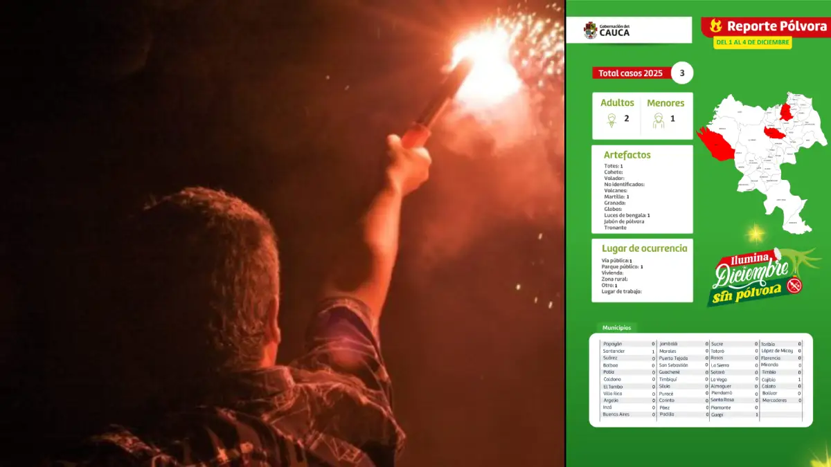 La Secretaría de salud del departamento del Cauca, emitió una alerta tras registrarse tres personas lesionadas por el uso de pólvora entre el 1 y el 4 de diciembre, marcando un preocupante inicio de las festividades. El reporte da cuenta del total de afectados, indicando que dos son adultos y uno es menor de edad, y que los hechos se registraron en los municipios de Santander de Quilichao, Cajibio y Guapi.