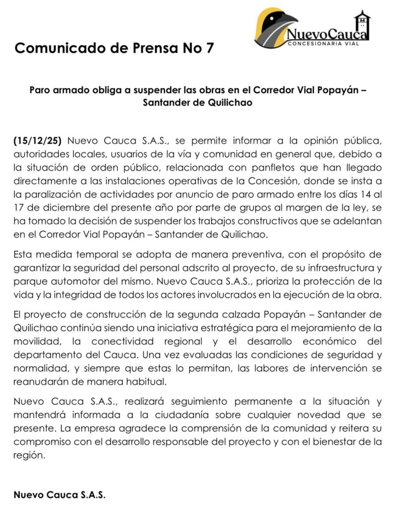 La Concesionaria Vial Nuevo Cauca S.A.S. informó a través de un comunicado que, debido a alteraciones en el orden público, se tomó la decisión de suspender los trabajos de construcción que se adelantan en la vía que comunica a Popayán con Santander de Quilichao. La medida responde a la llegada de panfletos directamente a las instalaciones operativas de la concesión, en los cuales grupos al margen de la ley instan a la paralización de actividades por un paro armado programado entre el 14 y el 17 de diciembre de 2025.