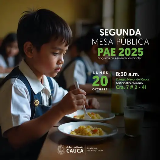 La Secretaría de Educación y Cultura del Cauca invitó a la ciudadanía a participar activamente en la Segunda Mesa Pública del Programa de Alimentación Escolar – PAE 2025, un espacio de diálogo y participación ciudadana que busca fortalecer la transparencia y la articulación institucional en torno a la alimentación de los estudiantes del departamento.