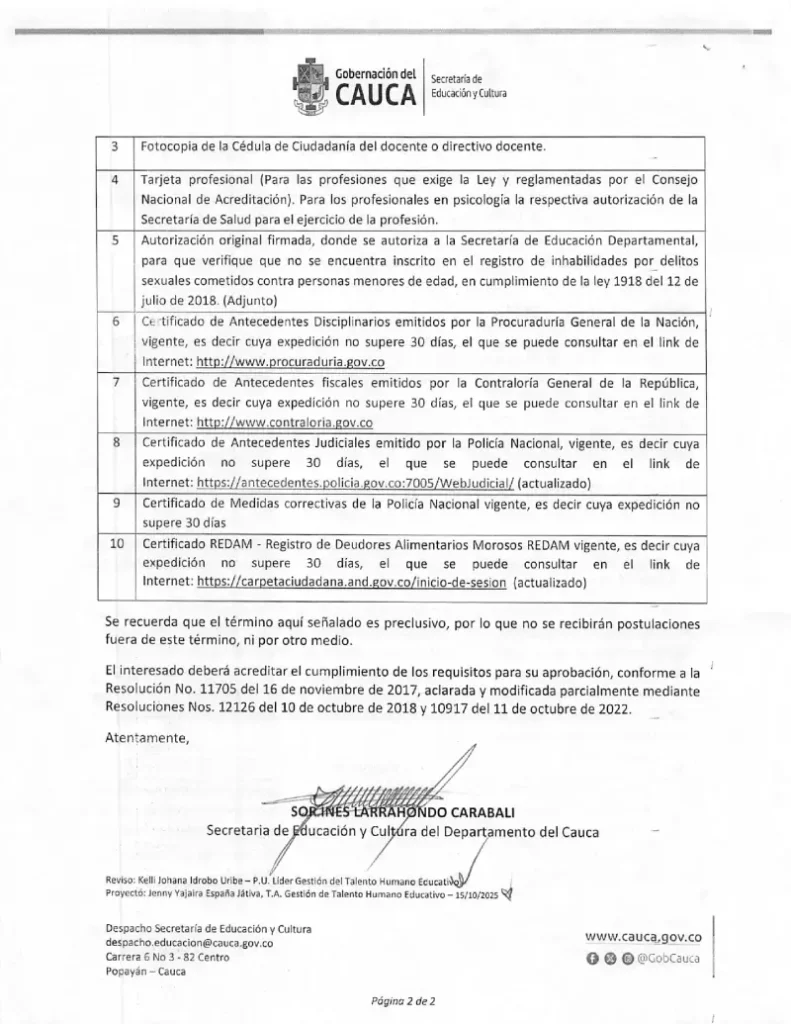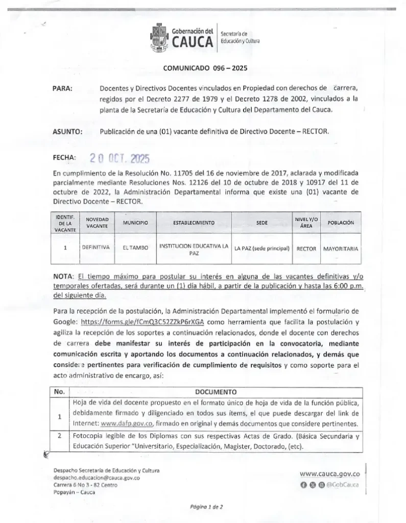 La Secretaría de Educación y Cultura del Departamento del Cauca, emitió el Comunicado 096-2025, a través del cuanl anuncia la publicación de una vacante definitiva para el cargo de Directivo Docente – Rector. Esta convocatoria está dirigida exclusivamente a docentes y directivos docentes que se encuentren vinculados en propiedad con derechos de carrera a la planta de la Secretaría, y que estén regidos por los decretos 2277 de 1979 y 1278 de 2002.