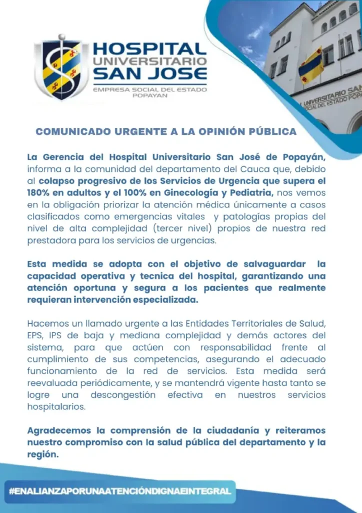 Finalmente, el Hospital Universitario San José de Popayán agradece la comprensión de la ciudadanía frente a esta emergencia funcional y reitera su compromiso con la salud pública del Cauca, reafirmando su misión de ofrecer atención especializada y humanizada a la comunidad.