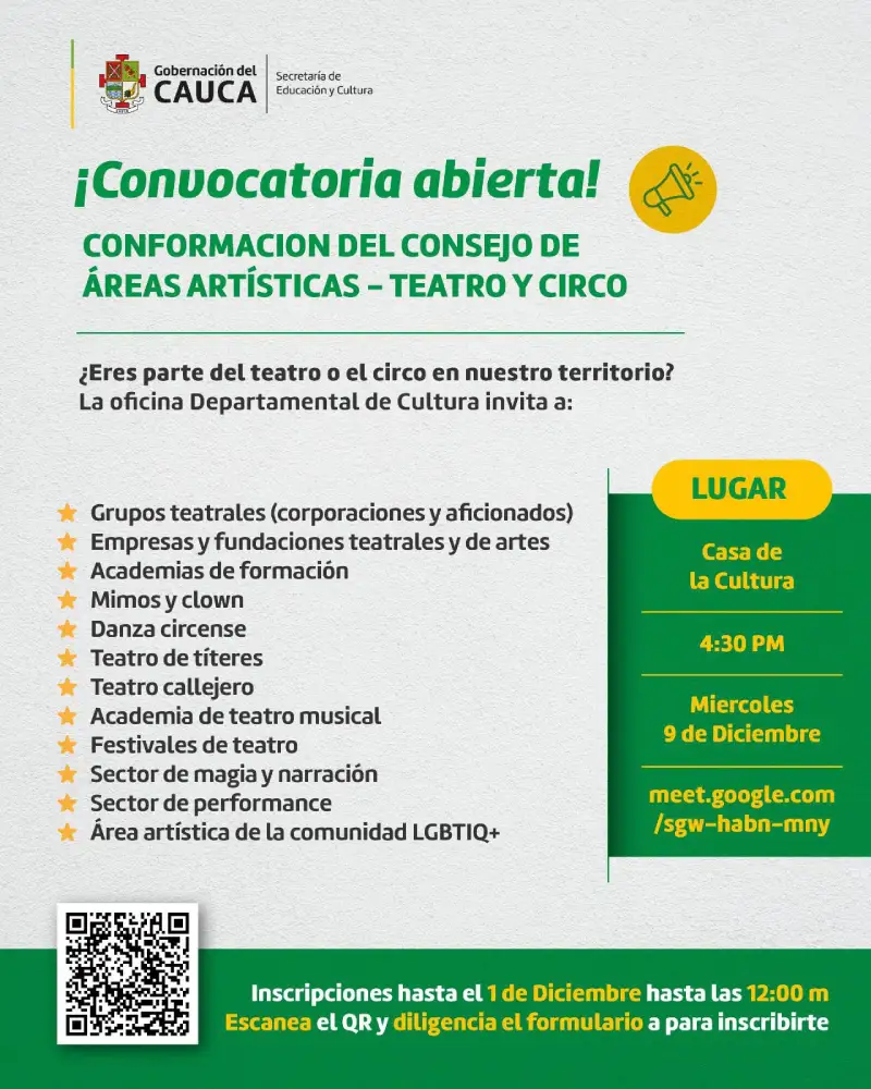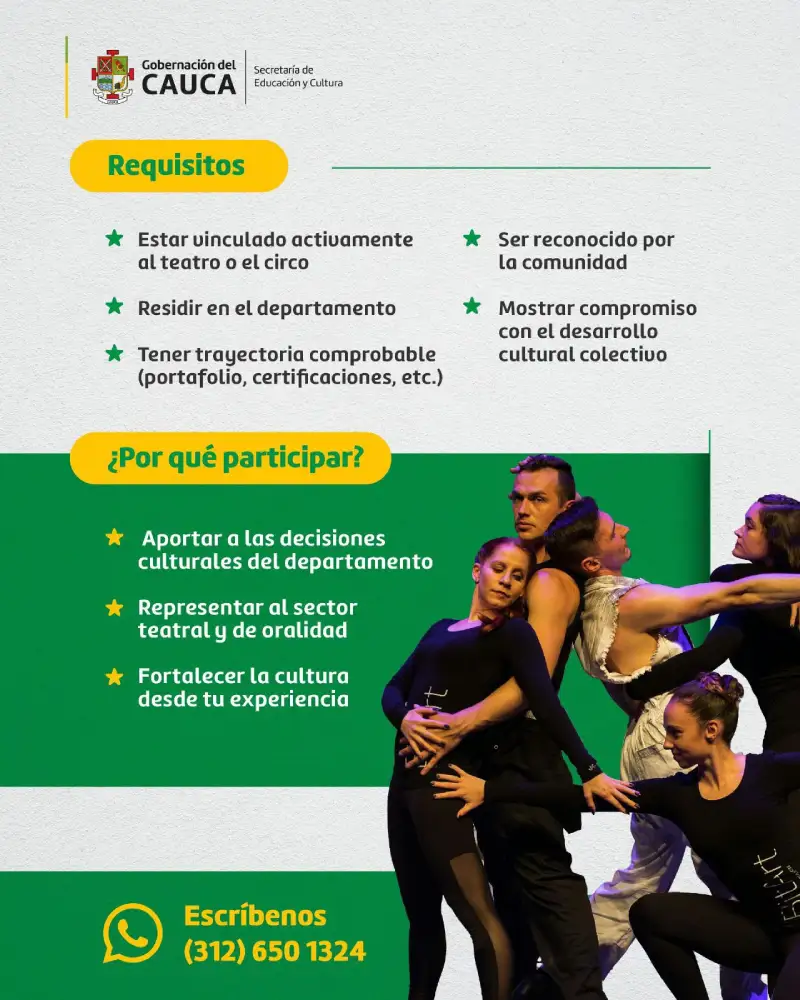 La Gobernación del Cauca, a través de la Secretaría de Educación y Cultura y su Oficina Departamental de Cultura, ha lanzado una convocatoria abierta para la conformación del Consejo de Áreas Artísticas – Teatro y Circo. Esta iniciativa busca reunir a los actores clave del sector para que participen activamente en las decisiones culturales del departamento y fortalezcan la cultura desde su experiencia.